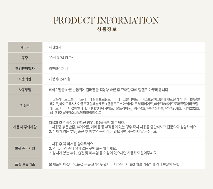 제품 주요 사양 (피부타입, 색상(호, 번) 등)